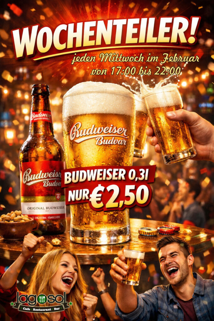 Jeden Mittwoch im Februar gibts im Lagosol einen Wochenteiler mit Budweiser Bier, von 17:00 bis 22:00 gibts das Budweiser Seidl um nur €2,50